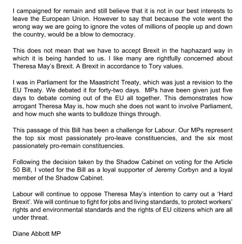More wiser heads than Corbyn’s on the left, such as Diane Abbot, are able to see how out of touch Corbyn’s retrograde form of feudal socialism is. His ambivalence on the Brexit issue clearly put the likes of Abbot in a difficult political position. The dilemma she, and other Labour MPs faced, was whether to vote with their conscience and in the interests of their constituents who voted to remain, or go against their principles by voting for the Article 50 Bill on the basis of maintaining a sense of loyalty to both their leader and to the Shadow Cabinet?